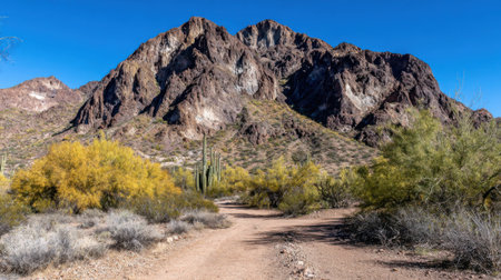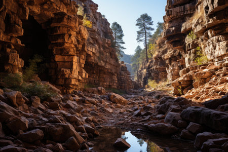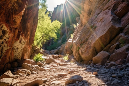 trail in a rocky canyon with shadows and sunlight, created with generative ai