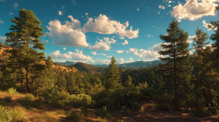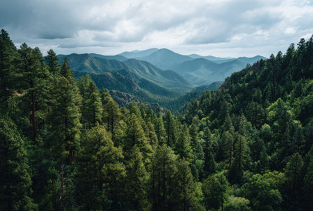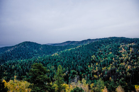 Scenic Colorado landscape view with vibrant forest, mountains, and cloudy sky.