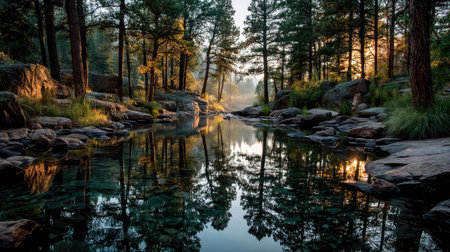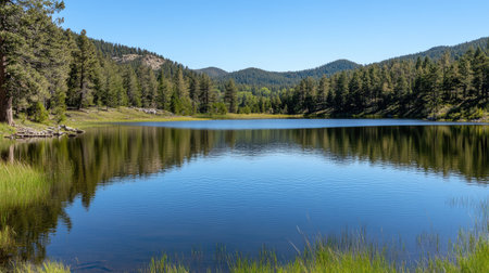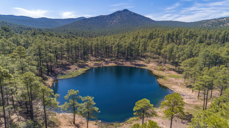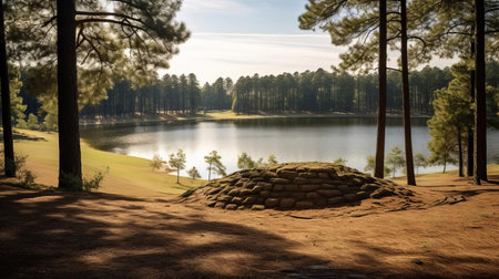 the serene lake mound, nestled between a cluster of towering pine trees, creates a picturesque scene, perfect for nature lovers and photography enthusiasts, offering a tranquil atmosphere and breathtaking views of the surrounding landscape and reflection of the trees in the calm water. ai generated