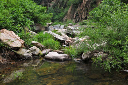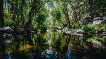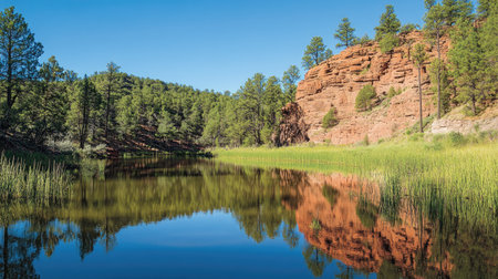 Serene canyon mirrored in a tranquil river with lush greenery. Calm gorge reflected in clear water with vibrant plants. Concept of natural beauty, tranquility, outdoor scenery, and reflection.