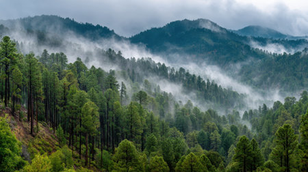 This captivating image captures a tranquil mountain landscape featuring lush pine trees shrouded in mist. The serene fog adds a mystical atmosphere to the remote wilderness.