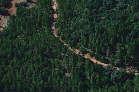 A stunning aerial view of a dense green forest with a winding dirt path cutting through. The natural colors and textures offer a peaceful and serene atmosphere.