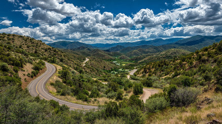 A winding road amidst lush green hills and majestic mountains, capturing the beauty of nature and tranquility in the landscape.