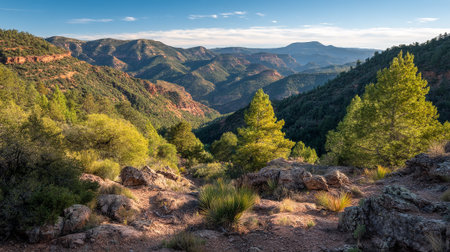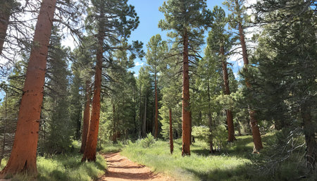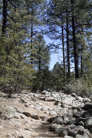 hiking trail through a dense forest with tall pine trees, rocky terrain, and a clear blue sky High resolution AI generated