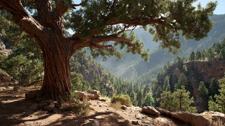 Vista of Breathtaking Forest Canyon with Majestic Tree Underneath a Bright Sky