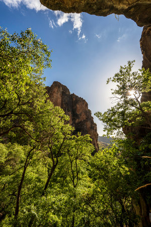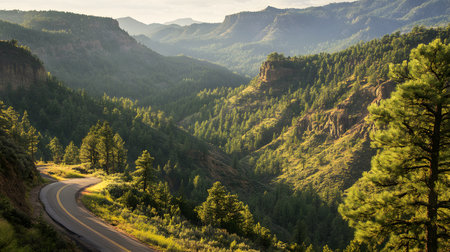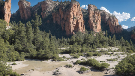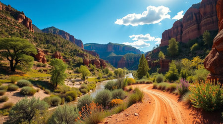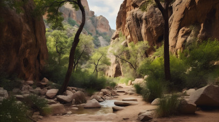 Peaceful canyon with winding hiking trail running through breathtaking scenery, surrounded by towering cliffs and lush greenery. AI generated