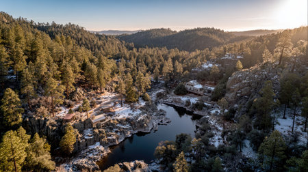 This stunning aerial view captures a tranquil pond nestled amidst a lush forest of pine trees, with majestic mountains rising in the background under a clear blue sky.