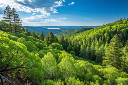 Verdant Forest Canopy Reveals a Glimpse of Blue Sky and Mountains