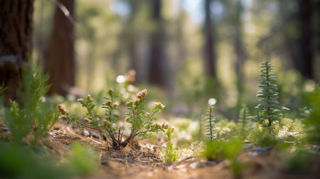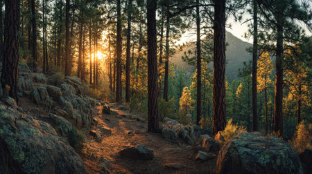 A tranquil forest scene captures a winding pathway illuminated by soft sunlight filtering through towering pine trees, creating a peaceful outdoor ambiance perfect for nature lovers.