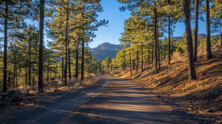 A beautiful dirt road winds through a tranquil pine forest, leading towards distant mountains under a clear blue sky, perfect for outdoor adventures.