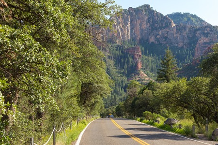The natural beauty of canyons and sandstone of Sedona in Arizona. Road leading through the canyon.
