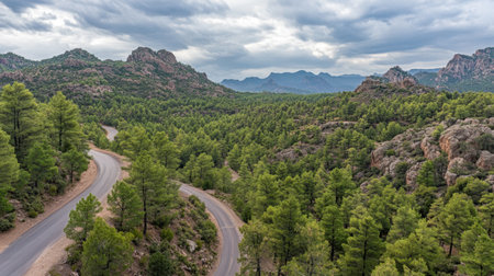 Discover a breathtaking mountain landscape featuring a winding pathway through lush greenery and dramatic rock formations under a cloudy sky.