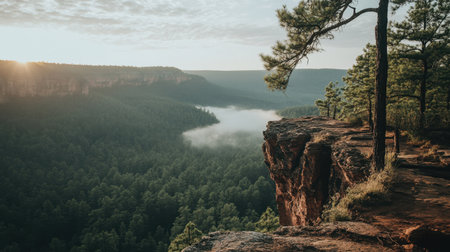 A stunning view of a cliff overlooking a lush forest valley, illuminated by the warm glow of the sunrise. Mist hovers above the treetops, creating a peaceful, serene atmosphere.
