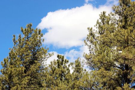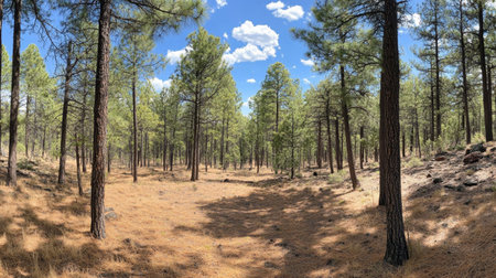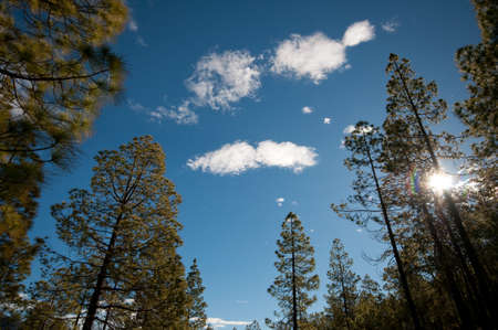 A low-angle shot showcases a sun-dappled forest with numerous pine trees reaching toward a brilliant blue sky, displaying a peaceful scene.
