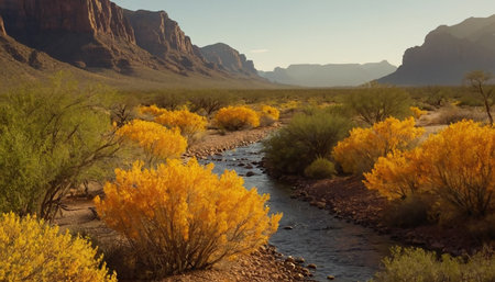 a serene lake in a canyon, surrounded by vibrant autumn-colored juniper trees, reflects their beauty on the calm water's surface. this tranquil scene captures the serenity and appreciation for nature's fall splendor. shot during golden hour, the image showcases the soft, warm light that illuminates the canyon, creating a captivating and peaceful atmosphere. ai generated
