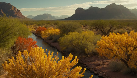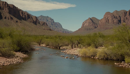 Serene River Valley Landscape in Arizona Surrounded by Mountains and Trees.