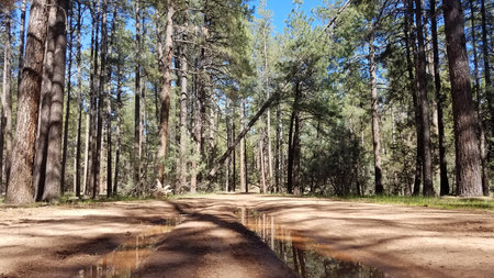 Tire Tracks with Water on a Dirt Road in Pine Tree Forest near Payson, Arizona