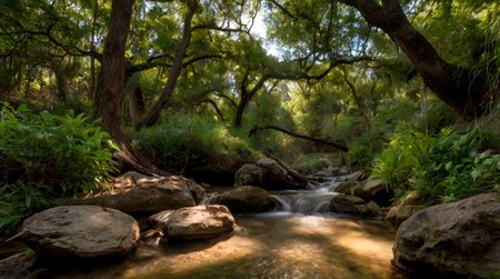 A stream winds its way through a dense forest, surrounded by large rocks and boulders. The water cascades over the rocky terrain, creating a dynamic and rugged natural landscape.