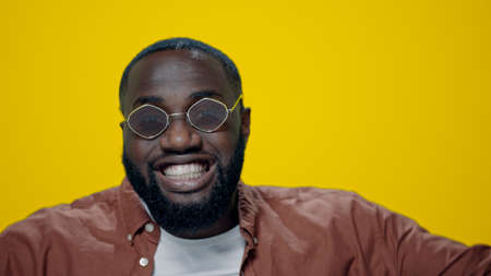 Portrait of happy young black guy in cap and yellow sweatshirt standing against isolated background
