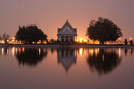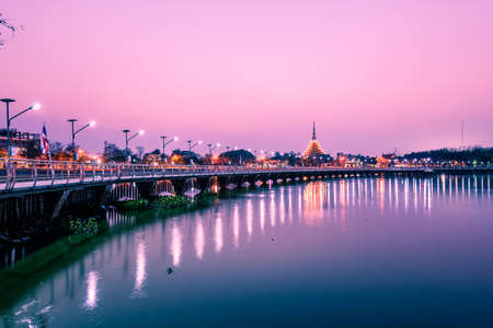 Beautiful lighting of Wat Nong Wang temple and reflection on the water at Khonkaen province,Thailand