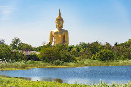 Tropical landscape with Giant sitting Buddha statue on sunny day. Wat Muang, Ang Thong, Thailand
