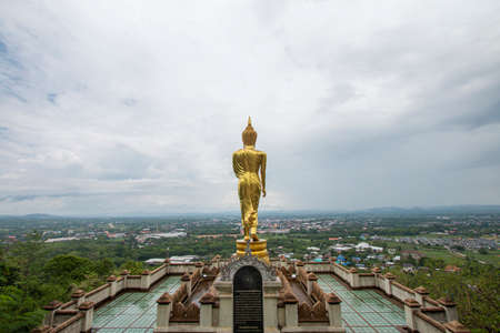 Nan Province, Thailand-June 2 2019. Beautiful view of golden buddha statue and landscape view of Nan Province from the top of Wat Phrathat Khao Noi.