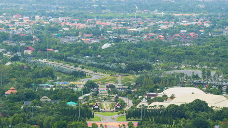 Aerial top view of Phutthamonthon, Bangkok City, Thailand. Thai buddhist temple architecture. Tourist attraction landmark.