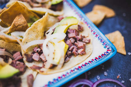 Delicious beef tacos and tortilla chips above dark surface