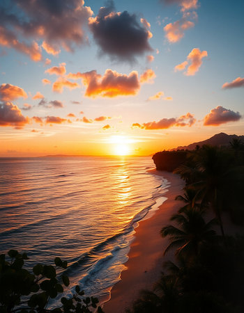 Witness the tranquil beauty of a Caribbean sunrise with vibrant clouds reflecting morning light, framed by lush palm trees and the peaceful sounds of ocean waves.