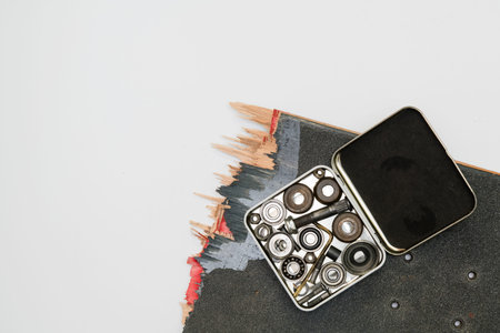 Surf skateboard parts, tools and assembly. Top view of skateboard assembling parts.
