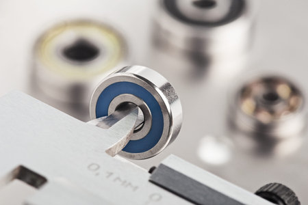 vernier caliper measures bearings against a metal background. Part of the mechanism.