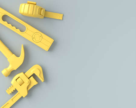 Top view of monochrome construction tools for repair and installation on grey and yellow background. 3d rendering and illustration of service banner for house plumber or repairman