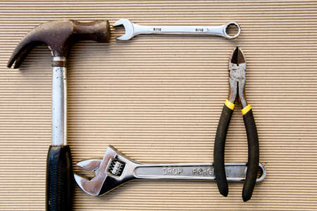 old grungy hammers and working tools on table, grunge background