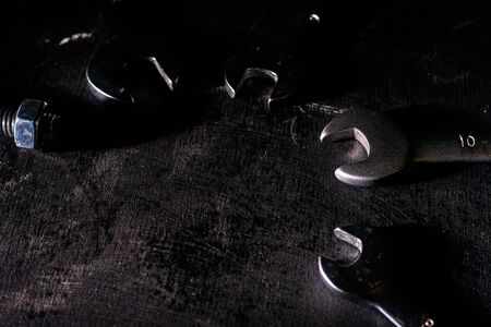 Double sided key, some nuts and bolts on black wooden background. Professional instruments, garage equipment, metal tools. Place for text.