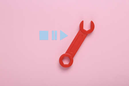 Wrench with icons start, stop, pause of media player on pink background. top view