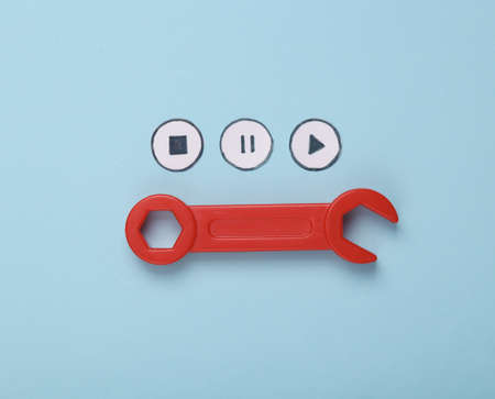 Wrench with icons start, stop, pause of media player on blue background. top view