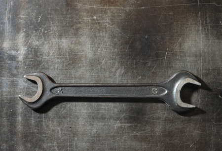 a spanner on old abandoned iron plate. - industrial workshop hand tools concept.