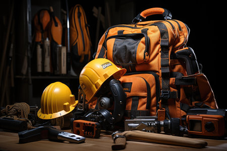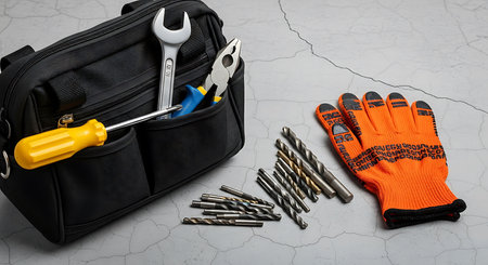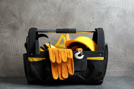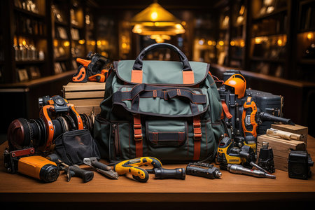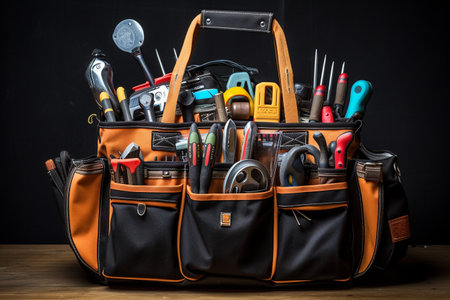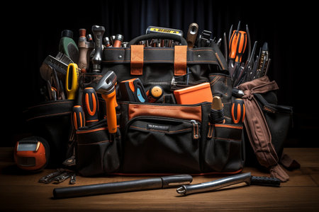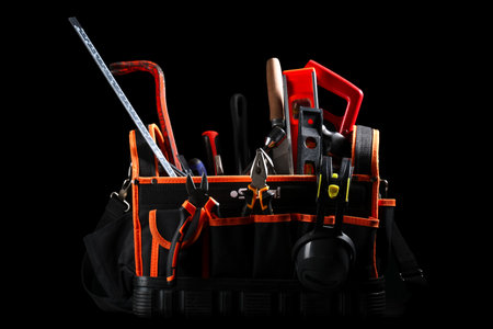 Black bag with construction tools on table