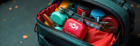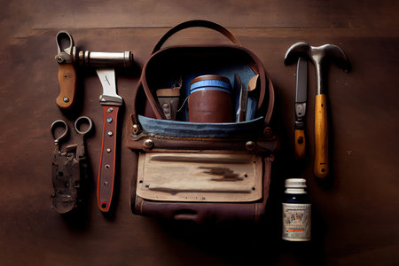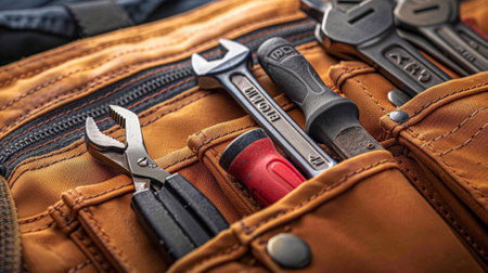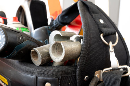 Closeup shot of a maintenance workers tool bag with tools for repair services. Concept Maintenance Workers, Tool Bag, Repair Services, Closeup Shot, Tools