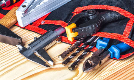 Work tools in bag on wood background. Tool bag
