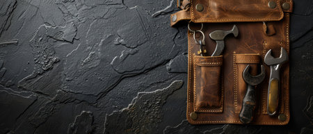 Tool belt with tools on wooden table, on dark grey background.