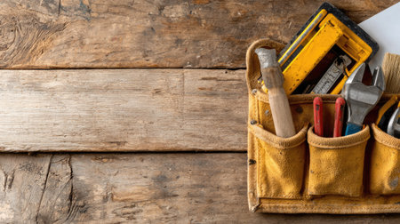 tools in tool belt on wood planks with copy space