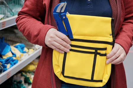 Woman in a building materials store chooses for buy a sturdy yellow tool bag. In the bag is a blue adjustable wrench. Concept of women independence, feminism, gender equality, repair and construction