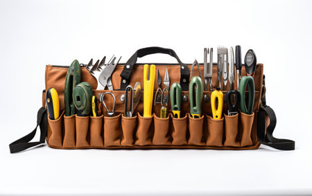 Tool bag filled with tools and tools on white background. Generative AI.