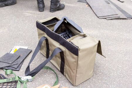 Bag with different tools for repair on street tiles outdoors