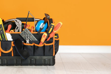 Bag with different tools for repair on floor near orange wall. Space for text