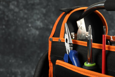 Bag with needle nose pliers, screwdrivers and other repair tools on dark background, closeup. Space for text