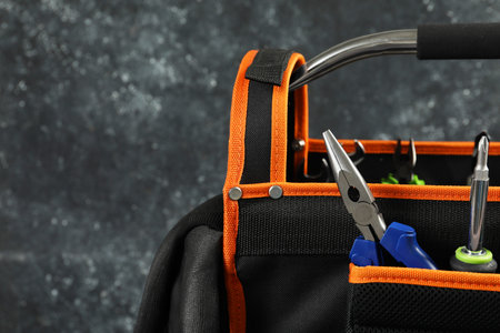 Bag with needle nose pliers, screwdriver and other repair tools on dark background, closeup. Space for text