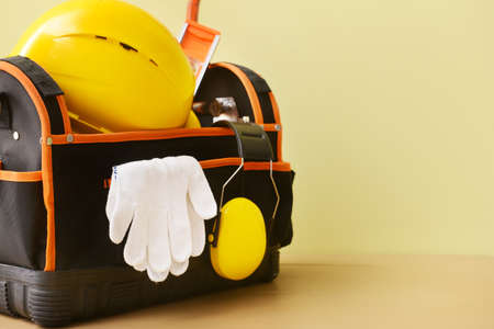 Construction Tools Bag and Safety Equipment Like Yellow Helmet and Gloves.