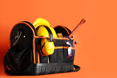 Tool bag with hardhat and construction tools on orange background
